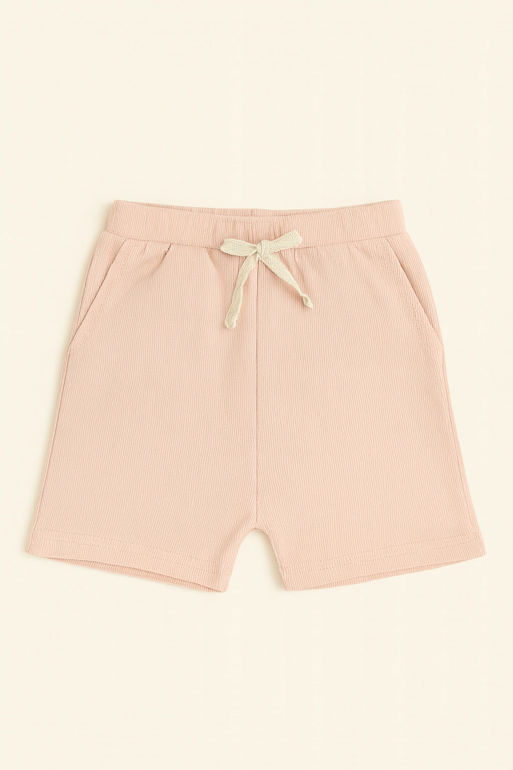 Short de bebé en tono rosado pastel, confeccionado en tela acanalada suave y ligera. Diseñado con pretina elástica y lazo ajustable para mayor comodidad y calce seguro. Ideal para el día a día, fresco y versátil para combinar con cualquier outfit.